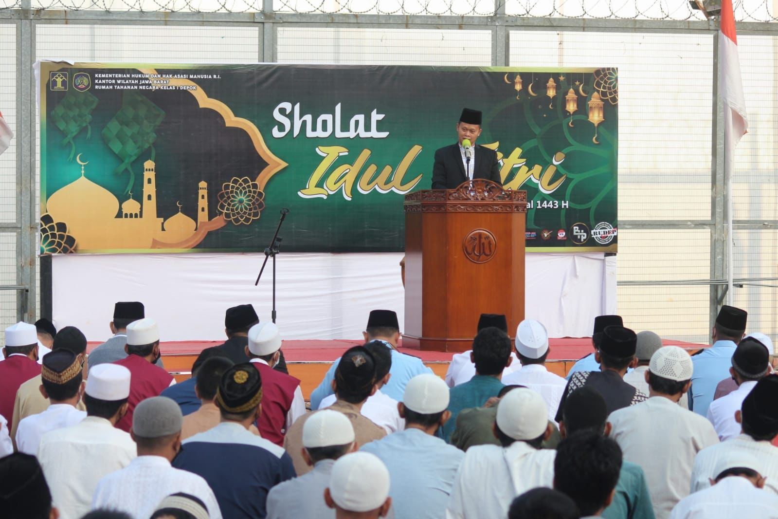Kepala Rutan Kelas I Depok, Andi Gunawan beserta Pegawai dan Warga Binaan Pemasyarakatan (WBP) pagi ini melaksanakan Sholat Idul Fitri 1443 H. Kegiatan yang digelar di Lapangan Olahraga Rutan Kelas I Depok ini berjalan dengan kondusif serta tetap menerapkan standar protokol kesehatan, (2/05/22).