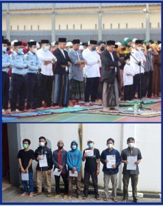 Suasana Khidmat dengan balutan rasa syukur atas nikmat yang Allah berikan terpancar dari para jamaah sehingga menambah haru bahagia suasana Idul Fitri. Rutan Kelas I Depok melalui Bantuan Hukum dan Penyuluhan (BHP) mendatangkan H. Khairul Ahyari selaku Sekretaris MUI Kota Depok sekaligus Ketua Majelis Baiturahhman Kota Depok sebagai Imam dan Khotib dalam Sholat Idul Fitri kali ini.