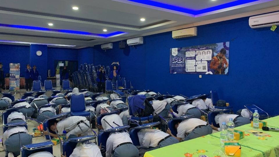 Dalam sesi simulasi gempa bumi, UPER dan tim BNPB melakukan penyelamatan diri sederhana dengan berlindung di bawah meja yang kuat. Langkah ini melindungi dari benda-benda yang mungkin jatuh atau terlempar selama bencana.