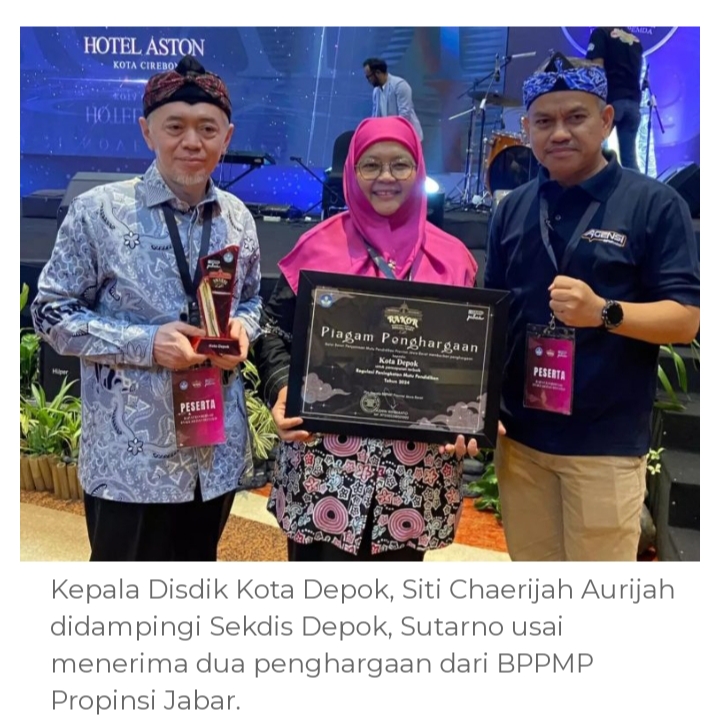 Depok- Laboranews.com | Jajaran dinas pendidikan (Disdik) Kota Depok berhasil menyabet dua penghargaan dari Balai Besar Penjamin Mutu Pendidikan (BBPMP) Jawa Barat yaitu Pencapaian Terbaik Regulasi Peningkatan Mutu Pendidikan Tahun 2024 dan Inovasi Pendidikan DESABUSA Tahun 2024.