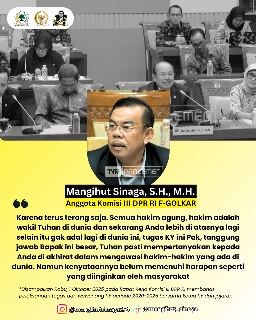 Anggota Komisi III DPR RI Fraksi Golkar dari Dapil Sumatera Utara III, Mangihut Sinaga, S.H., M.H., menekankan pentingnya peran KY dalam menjaga integritas hakim. Ia menilai, di tengah berbagai kritik masyarakat, KY perlu menunjukkan keseriusan dalam melaksanakan tugas pengawasan dan rekrutmen hakim.