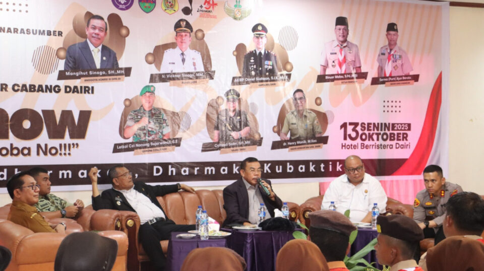 Dairi, 13 Oktober 2025 — Anggota Komisi III DPR RI Fraksi Partai Golkar, Mangihut Sinaga, S.H., M.H., menegaskan pentingnya peran generasi muda, khususnya Gerakan Pramuka, sebagai garda terdepan dalam upaya pencegahan penyalahgunaan narkoba. Hal ini disampaikan dalam Talkshow bertajuk “Pramuka Yes, Narkoba No!” yang digelar oleh Kwartir Cabang (Kwarcab) Gerakan Pramuka Dairi di Aula Hotel Beristra, Sitinjo, Senin (13/10/2025).