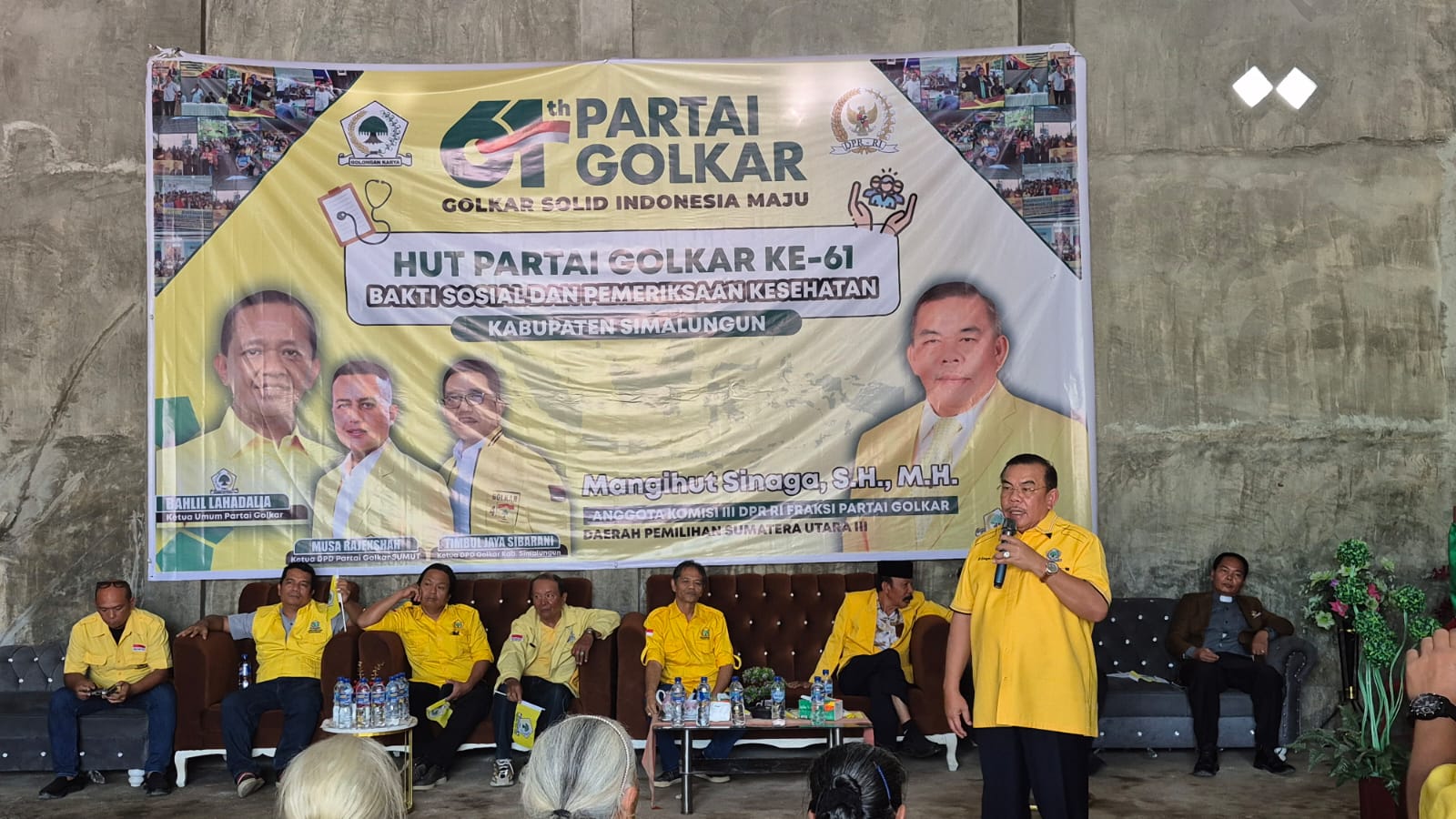 Anggota DPR RI Fraksi Partai Golkar, Mangihut Sinaga, S.H., M.H., bersama pengurus DPD Golkar Kabupaten Simalungun, melaksanakan kegiatan sosial berupa pembagian paket sembako dan pemeriksaan kesehatan gratis bagi masyarakat Kecamatan Panei dan sekitarnya sebagai bagian dari agenda reses dan perayaan HUT Partai Golkar ke-61.