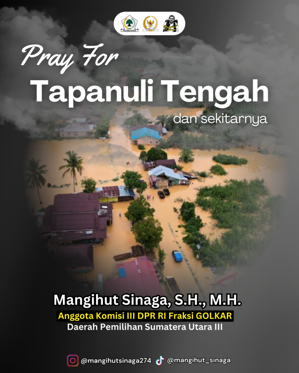 Anggota Komisi III DPR RI Fraksi Partai Golkar, Mangihut Sinaga, S.H., M.H., menyampaikan duka cita yang sangat mendalam atas bencana banjir dan tanah longsor yang melanda sejumlah wilayah di Sumatera Utara, termasuk Kota Sibolga, Tapanuli Tengah, Tapanuli Selatan, Mandailing Natal, Tapanuli Utara, Nias Selatan, dan Kota Gunungsitoli.