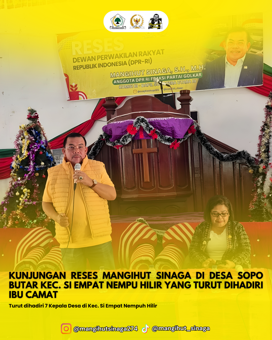 Anggota DPR RI Komisi III Fraksi Partai Golkar, Mangihut Sinaga, S.H., M.H., melaksanakan Kunjungan Kerja (Kunker) Reses di Kabupaten Dairi, Jumat (13/12/2025). Kegiatan reses tersebut berlangsung di Desa Sopo Butar, Kecamatan Si Empat Nempu Hilir, dan dihadiri oleh Camat Si Empat Nempu Hilir, 7 Kepala Desa se-Kecamatan Si Empat Nempu Hilir, tokoh masyarakat, tokoh agama, serta warga setempat yang antusias mengikuti dialog bersama wakil rakyatnya.